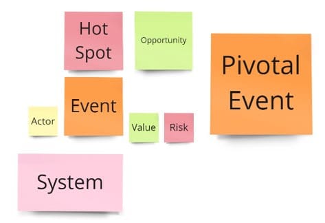 - Recognizing Values and Risks – at this point, we encourage participants to attach sticky notes that denote ‘value’ or ‘risk’ next to the events they believe influence profits or losses. This, coupled with the identification of pivotal events, sharpens our focus on the domain’s most significant elements.